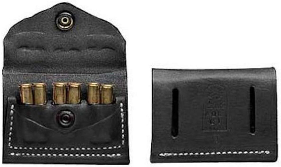 This unique pouch maximizes both security and speed of loading. For .38/.357cal, the six cartridges are separated in tiers which can be loaded into the cylinder in three controlled steps. The .44mag pouch and .50cal cartridge holders have a 3x3 design. Available in black or tan unlined leather. Accommodates belts up to 1 3/4-Inch wide.