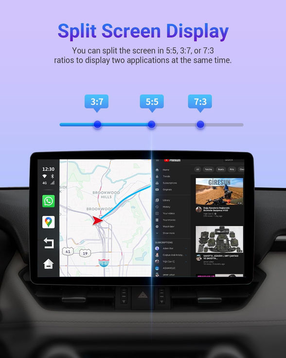 【 SUPPORTED APP EXPANSION & SPLIT SCREEN 】 Streaming any video to your cars !(YouTube, Netflix, Amazon Prime,Disney Plus, Tiktok Hulu, etc.). Get various car navigation apps (Google maps, Waze,Yahoo! ). Use all kinds of music apps you like (Amazon Music, YouTube Music, etc.). In addition, it has a function to split the screen into two, so you can enjoy the video while navigating. You can choose between 3:7, 5:5, or 7:3, and you can freely switch between left and right apps.